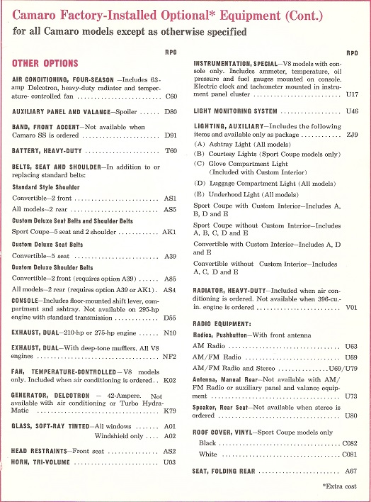 Here's an item of literature that shows this stripe, which presumably was a mid-year item: http://www.superchevy.com/features/c...ales_brochure/ The data plate of this Camaro is utterly conventional so there aren't any answers there. I know there's been a discussion here'n there about this stripe, but I thought I'd check in and see if anyone else has seen another car like this and what other bits of info may be out there. It's strange that something that appeared in a brochure is so obscure. PS> Yeah, I know, the side badging is strange... |