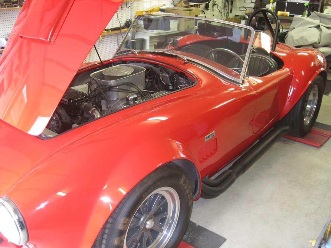 an 87 year old lady called me to ask if I'd take a look at her late husband's car. She had no idea of the details of the car - other then it was a Cobra and she wanted to sell it! naturally, there was only about a 1% chance that it was the real thing - but I had to take a look. When I opened the garage door, here's a picture of what I saw - no, unfortunately it's not a real 427 Cobra. It is aluminum though. VIN starts with DRF - gotta figure out what that stands for.