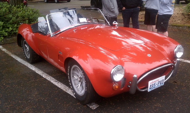 It was an overcast day in Seattle, but I took my '66 GT to the Mustang Roundup in Bellevue today. In the row for Cobras, which had a few kit cars in it, I spotted a slightly tattered, red wide-hip roadster with Sunburst wheels and undercar exhaust. Rolling on some '75-era first generation BFG Radial TA's. Hmmmmm. Sure enough, an untouched time capsule that I'd never seen before. I was able to chat up the amiable (other than regular loud requests to PLEASE DON'T TOUCH IT! ITS ALUMIUNUM) owner and get the story. He bought it as a 19 or 20 year old in 1969...and has had it ever since. You will see the interior has some wear from this big guy getting in and out of this little car, but the leather is great and it is breathtakingly honest. It probably hasn't been detailed since the 80's. He likes to keep a low profile, but his friend convinced him to bring it out for a few hours. I'm so glad he did. 427 4V. For those of you grabbing your Shelby Registry, its #3340, and he is Mr. Anonymous