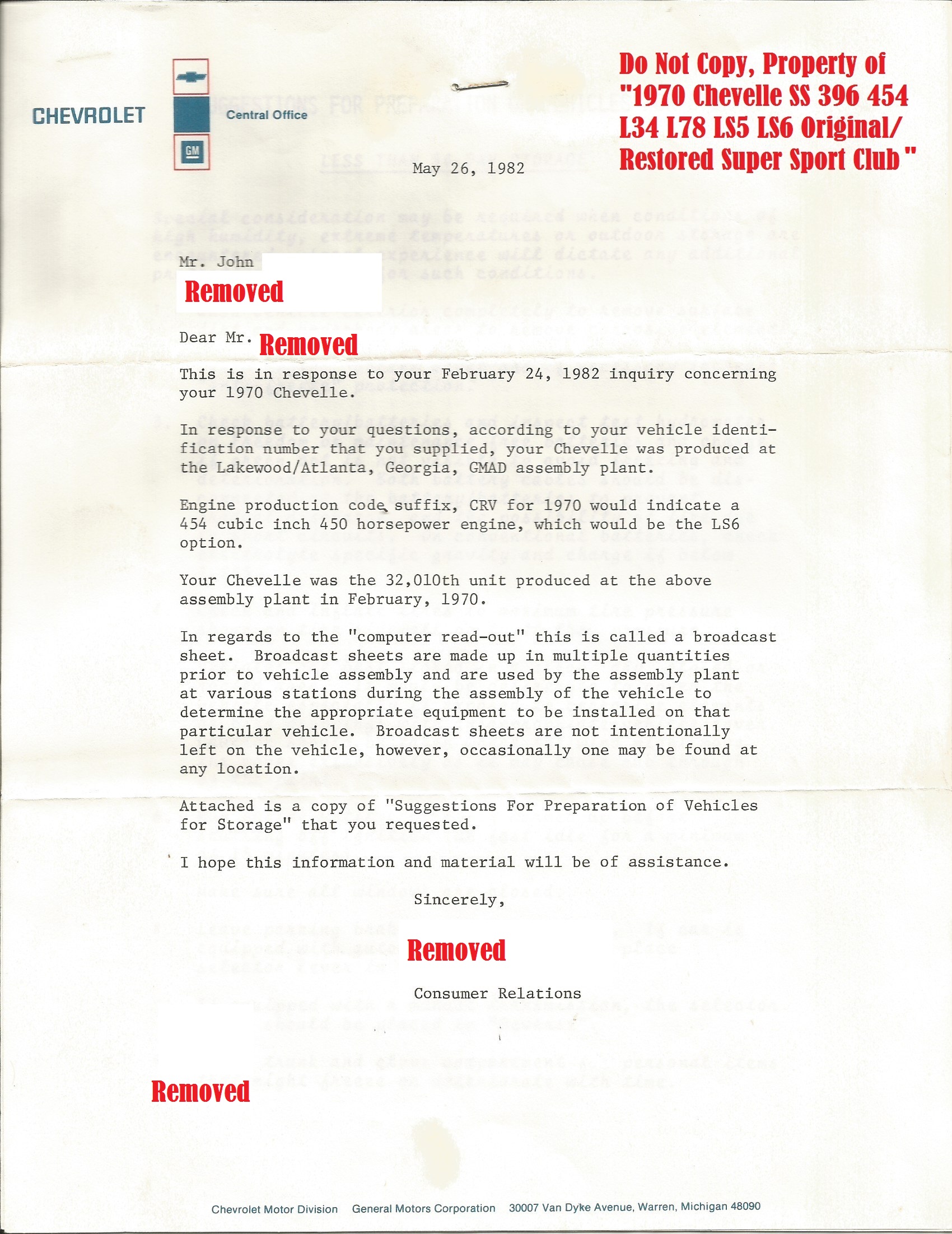 A letter from GM Chevrolet that tells the new owner how is car was ordered. This LS6 1970 Chevelle was ordered out of Buffalo NY so it is not a Canadian ordered car.
