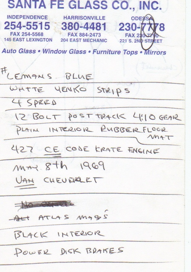 The man who holds the records for the Novas is Vince Emee. The last time he and I spoke he told me that he will only provide a verbal verification of the documentation he has. He is no longer providing copies of his records. According to the info he provided in the past regarding this Nova he has confirmation of the 427 conversion as well as the original Yenko network selling dealer. Of all the Yenko Novas found to date, there exists only one with a Yenko Invoice showing the 427 conversion. |