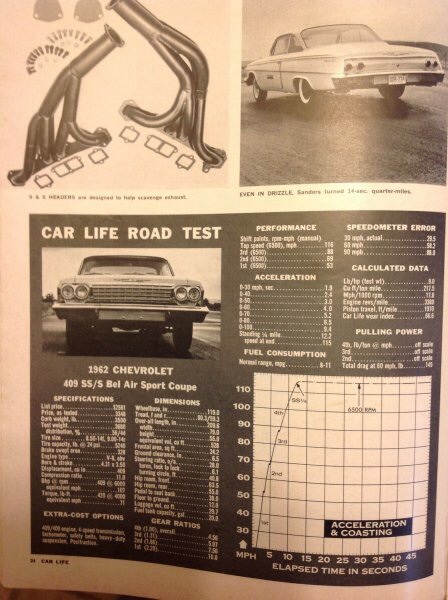 The '62 409 being referenced is obviously the famous Car Life road test of Frank Sanders' 409/409 Bel Air with S&S headers, 4.56's and Casler recaps. Not only that . . . it was done in the rain!