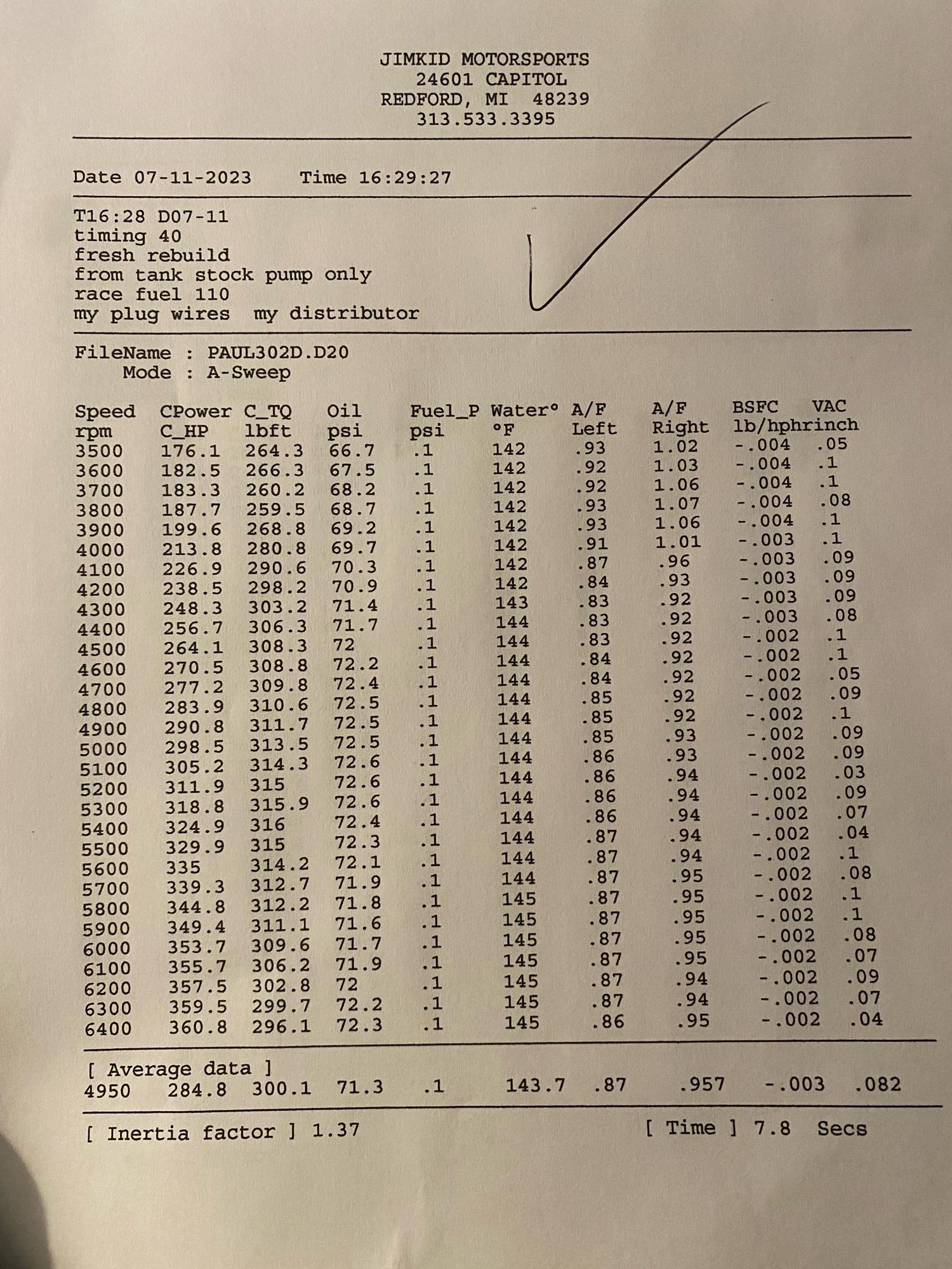 Spent yesterday at Jim Kid Motorsport’s dyno with my 302. The engine was rebuilt 30+ years ago so a friend of mine who specializes in Mopars went through it for me. The entire rotating assembly is original as well as the cam and pistons (so standard bore). Has NOS stamped steel rockers as well as NOS lifters and pushrods. The only “enhancements” made are a Cloyes double roller timing chain and Mahle piston rings (also headers). The rotating assembly was also balanced. I converted my distributor from points to Breakerless SE which I had good luck with in my L78 Nova. Unfortunately, this one would start breaking up at 6000. So we ended up swapping it out with an MSD unit. Best pull was 40 degrees advance, 110 octane @6500 = 360 hp. The nice surprise was leaving everything the same but running 93 pump fuel which dropped us about 2 1/2 - 3 hp. If we didn’t run out of time, I think we could have squeezed a few more out advancing to 42. Used a set of new AC 43s and they looked great when we pulled them. Totally happy with the result.
