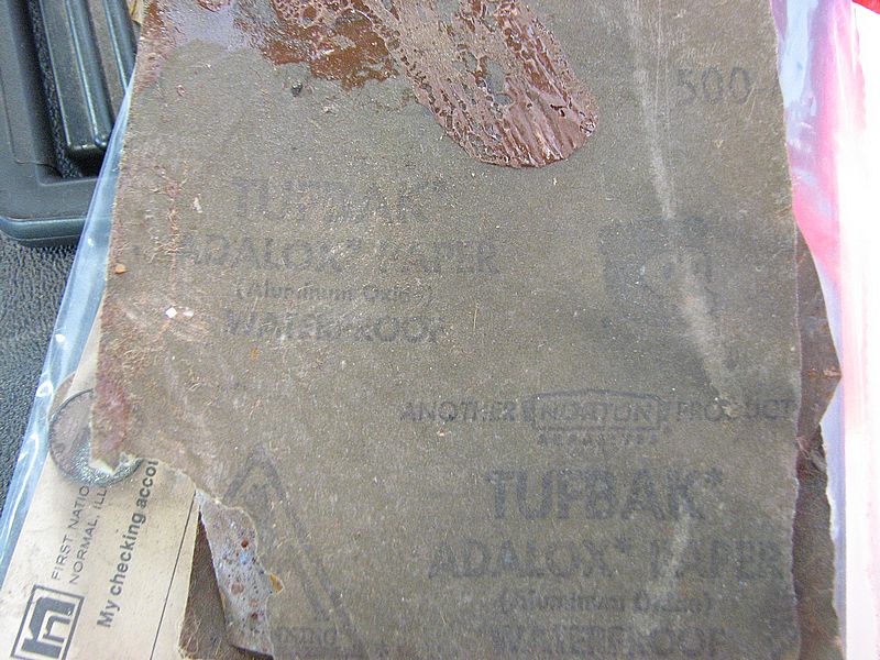 Found this piece of the wet sand paper that GM used in their bodyshop in a 63 Chevy II. It still had the orange adhesive sprayed on it where they glued down the sound deadener and carpet.