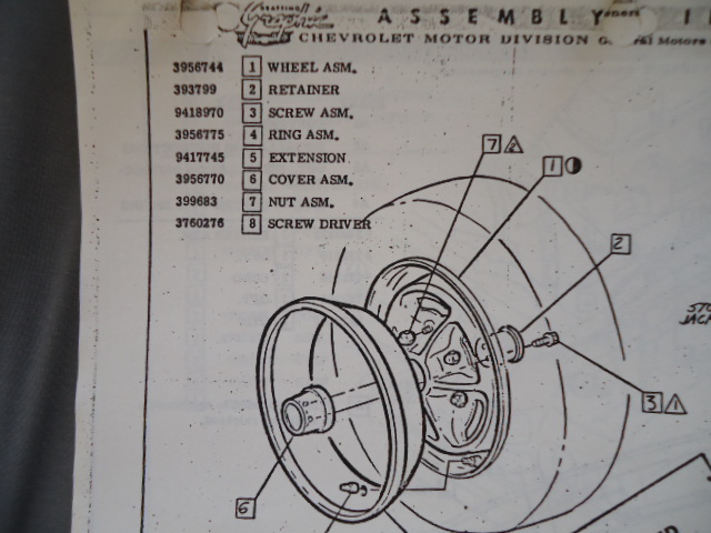Rick, it's interesting that the 70 assembly manual has the components of that wheel illustrated, whereas the 69 manual does not. Phil, I would certainly appreciate any further insight you could provide. I am thinking that my convertible has pan head Phillips screws to retain them, but it's been almost 15 years since I've had them off the car, so I can't be certain about that, or if there was any type of washer used. And since you mentioned it, I do recall hearing the wooden handle screwdriver story before, although I have certainly never seen or heard of one with a car. Mark, I suppose it's certainly possible that different assembly plants used different type fasteners, or that there was a running change of type during the production year.