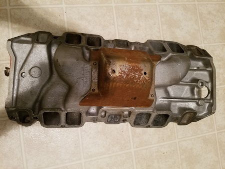Early take off Low Rise Aluminum Square Port, 3963569 454 Big Block and 396 375hp. This intake is in MINT Shape and does't even have carbon build-up. It still retains the original factory orange over spray. Sold