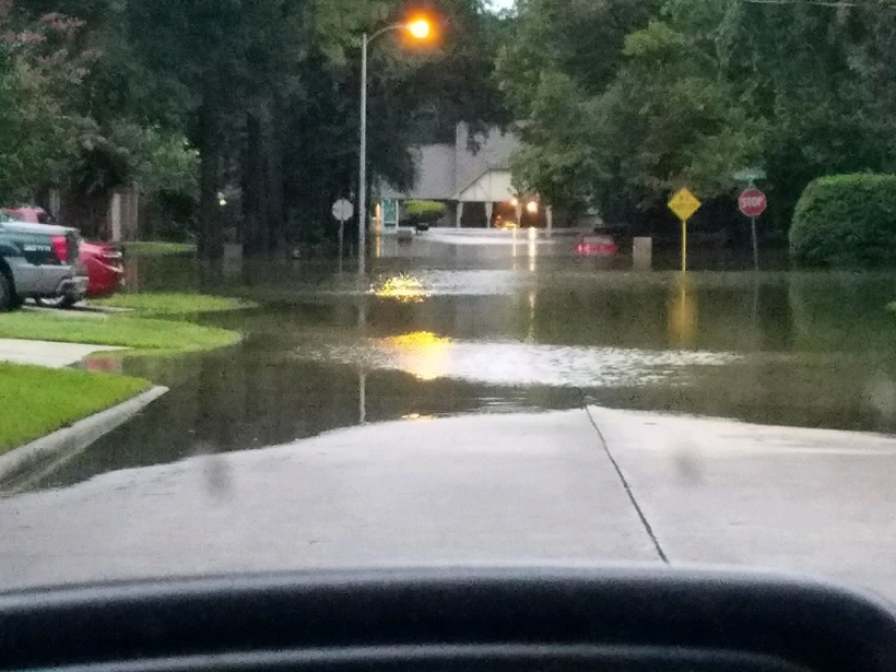 These photos show the clubhouse pool. There is an olympic sized pool there somewhere as well as tennis courts and a large parking lot. This was taken right before the street flooded in the latter photos. You can see that intersection is now fully flooded and I wasn't able to get further down due to the high water.