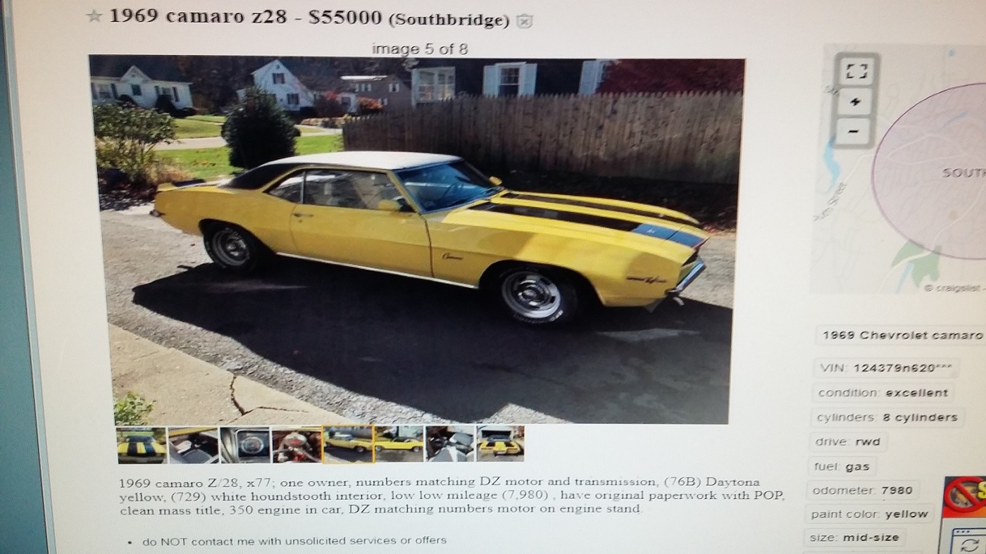 Miami linked ad live again, w/ update? ![]() ~ Pete . -------------------------------- 1969 camaro Z/28 survivor - $55000 (Southbridge) hide this posting image 1 of 9 © craigslist - Map data © OpenStreetMap (google map) 1969 Chevrolet camaro VIN: 124379N620*** condition: excellent cylinders: 8 cylinders drive: rwd fuel: gas odometer: 7980 paint color: yellow size: mid-size title status: clean transmission: manual type: coupe Real one owner, low low mileage, Z/28. Matching numbers 302 engine, matching numbers M21 4 speed transmission, SCCA racing history, code 76b, 729 interior, X77 model, This may be the one, if you have been looking for a real matching numbers Z28. Have original warranty card with POP, documented SCCA race history. Clean Mass. title do NOT contact me with unsolicited services or offers post id: 6746881624 posted: 12 days ago updated: about 18 hours ago email to friend ♥ best of [?] -------------------------------- .
