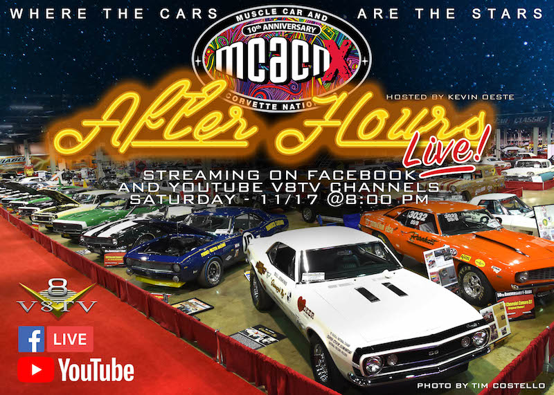 If you can't make the Muscle Car and Corvette Nationals in person, or even if you can... be sure to join us Saturday Night 11/17/2018 at 8:00 PM Central for Muscle Car and Corvette Nationals After Hours Live! broadcast presented by V8TV! We'll be streaming all over the world LIVE, sharing cool cars, interviews, and features from the show. Here's the link to watch it on YouTube, but it will also be carried on Facebook.