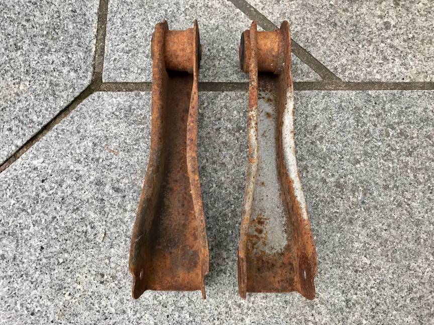 This is an original pair of GM upper control arms for 1968-72 Chevelles & El Caminos that were equipped with a 12-bolt rear axle. The left arm is notched and is reinforced around the bolt hole from the factory to clear the size of the differential housing. They are in good restorable condition with the original bushings intact. (SOLD)
