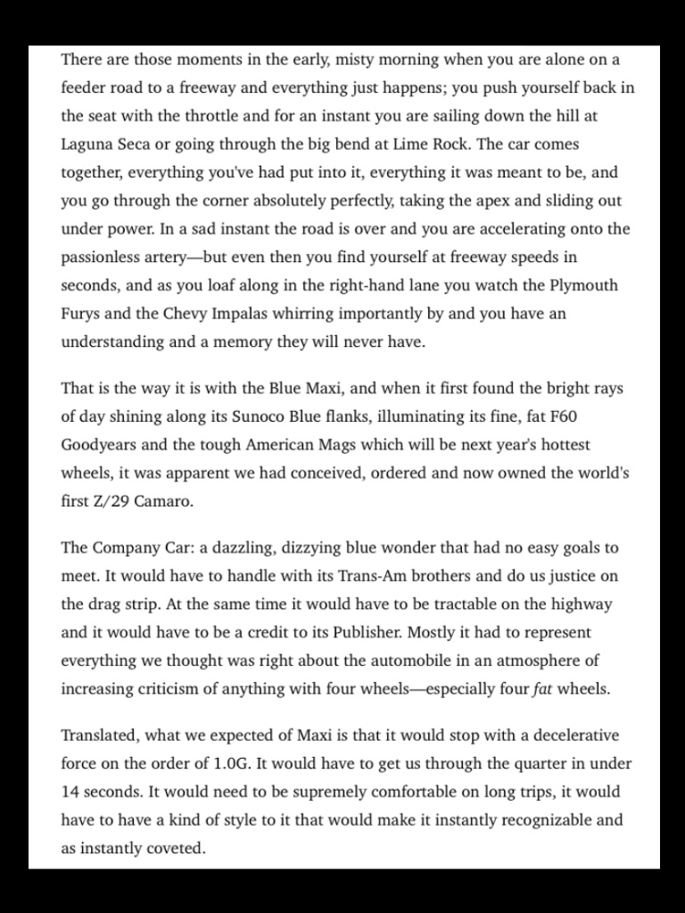 Just read the Jan '70 Car & Driver LT-1 w/ AC 'Blue Maxi' article and thought I'd post it here. Such a cool car also awesome it exists today! ![]() ~ Pete .