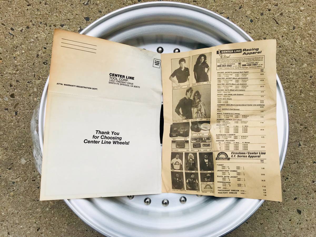 This is a new old stock Centerline Auto Drag wheel in satin finish. It is a 15x7” wheel with a GM 5x4.75” bolt pattern. It comes with a C-70 center cap as well as the registration & installation paperwork. The wheel is dated 9/88. I do not have the original box for it, but it is still wrapped in the plastic bag it came in. (SOLD)