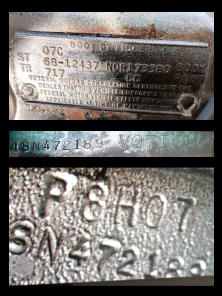 1968 Z/28 Corvette Bronze. Black Hounds Tooth. 02E Los Angeles born 3/13/1968 pnt OO 1969 SS396 Yellow/Yellow 08E Norwood born 8/28/1969 pnt 76E 1970 'cuda Moulin Rouge, 440-6, 4 speed |