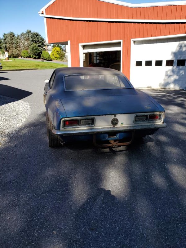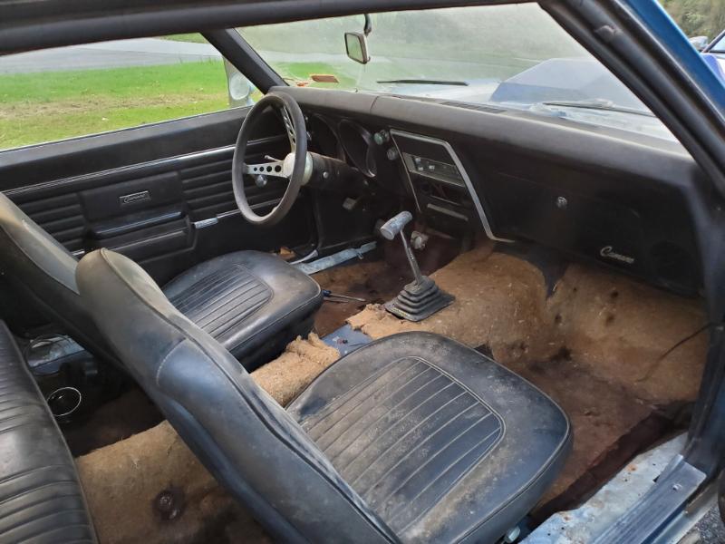 Picked up a Lemans Blue 05E 68 SS 4Spd Camaro. It needs alot of love, but I had to save her. Sitting since 1978 and has 70's look with Cragars, Air Shocks, Traction Bars, Transparent Hood Scoop, Painted White Underside Suspension, Tow Hitch and lets not forget the shag carpet that I immediately removed.