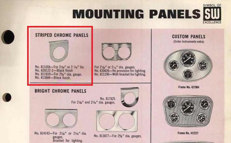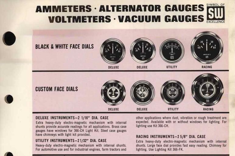 -80 Lbs Pressure no part number found 2 1/16" Deluxe series with SW Bright Chrome Panel $125 -80 Lbs Oil Pressure 360-UB Cable drive 2 1/16" Deluxe series $125 -100 Lbs Oil Pressure 691-CB 2 5/8" Racing Series with SW Striped Chrome Panel $150 -9000 RPM Tachometer 535-AH Cable Drive 3 3/8" with SW Black Panel $250 1968 SW catalogue photos. Sold "AS IS" Shipping add $14, Paypal "Friends"