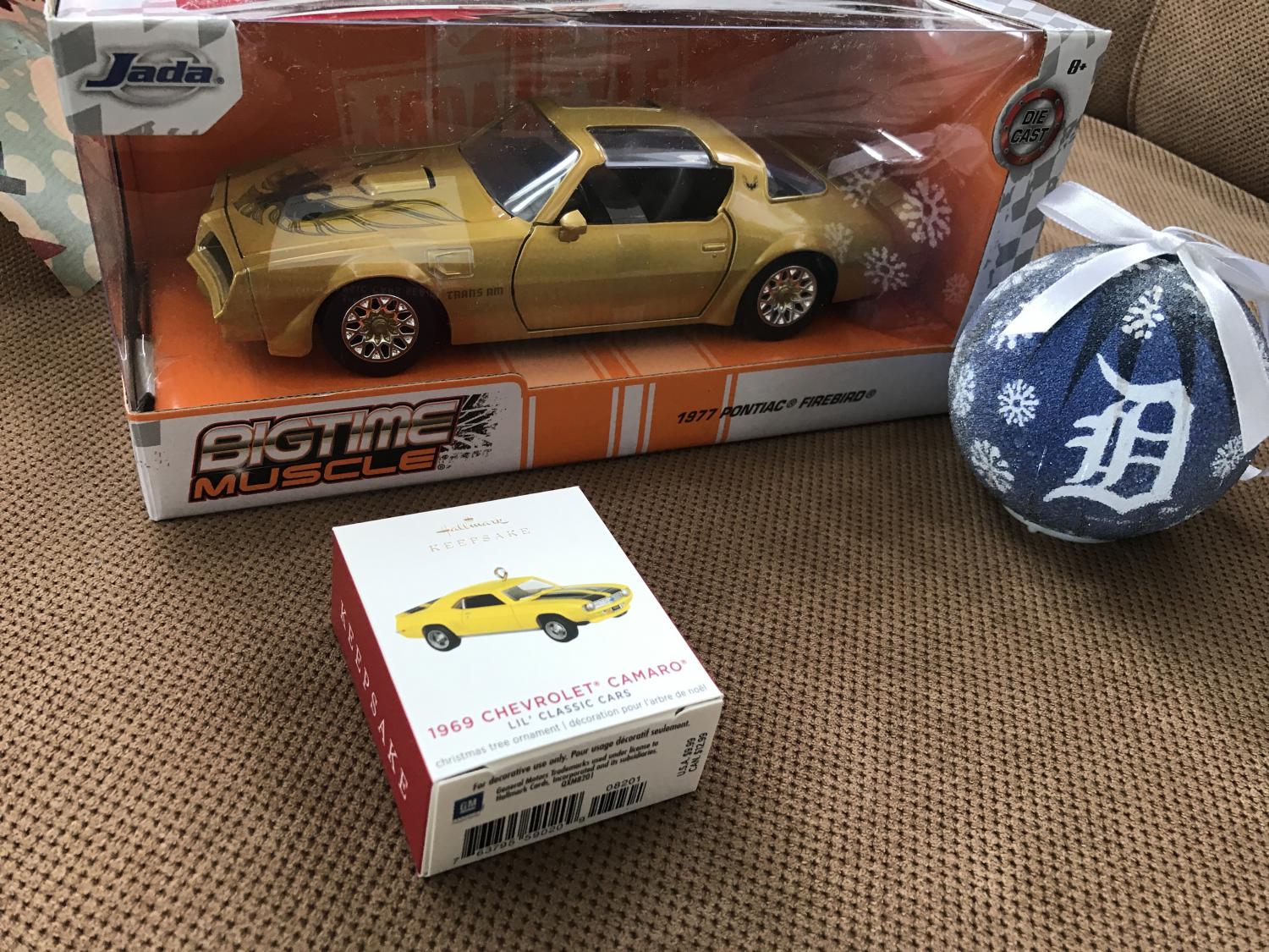 I got a Goldie from my daughter, a 69 camaro for the small tree I do up out in the garage, and a sweet rocker chair with a built in cooler for up on Woodward.