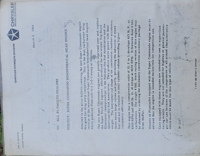 Real deal. One of approx 100 Factory built race cars. No rebody issues and very correct Sold and raced in New York State In the Chrysler Registry Retoration photos Ready for a Museum or Collection, race track or cruise night. This thing runs awesome. Correct / original trans (unobtanium) No parking gear. 1,150miles, many a 1/4 at a time Modern prep race Hemi, makes 632hp on race gas $125,900.00 obo/trade Call 630-377-1222 for more info. Last edited by Stefano; 03-08-2021 at 09:25 PM. |