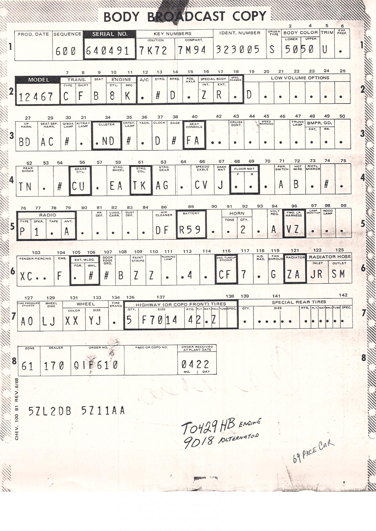 Note that there a 2 types of broadcast sheets. Body and chassis. The one typically found on the gas tank of LA cars is the chassis broadcast sheet, which would have traveled the chassis assembly line taped to the fuel tank before the mating with the body.