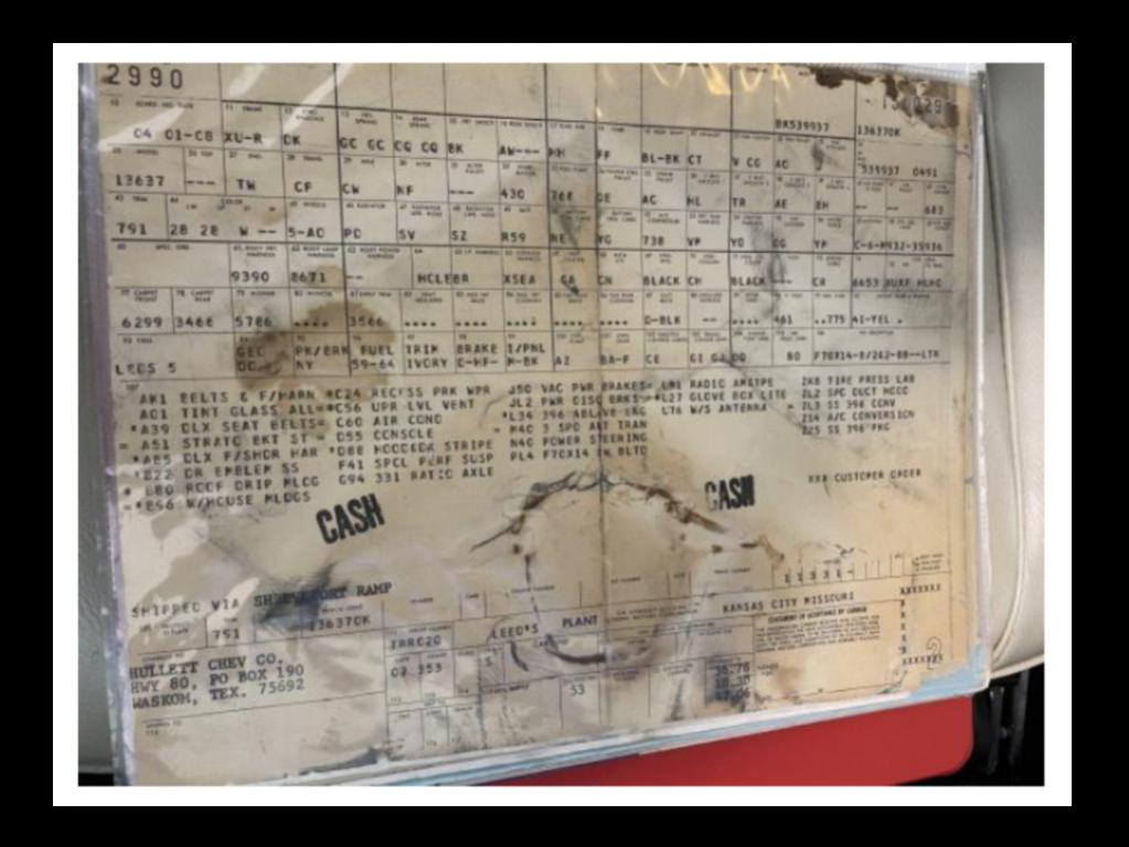 Any thoughts on the build sheet shown in this listing? If nothing else, why would someone stamp "CASH" in big block letters, in two places, on a build sheet? Appears that the white vinyl roof has been added at some point post-build.