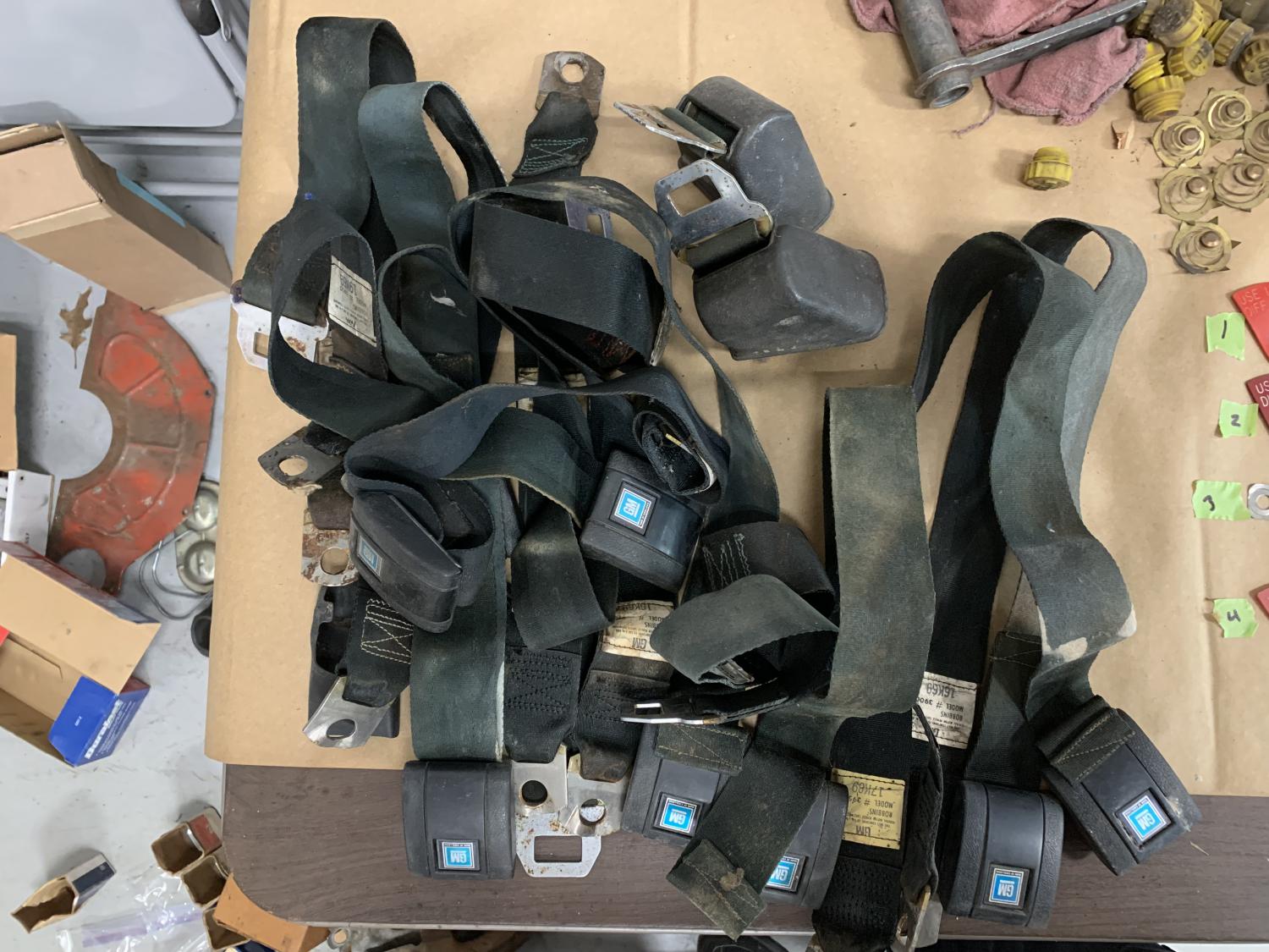 Black dated 69. Not sure what I took these from. Chevelle or full size. Two retractors that work, 8 female receivers, 4 male ends and 2 mount covers. These are dirty and some rust. May clean for driver or for parts. 125.00 shipped lower 48