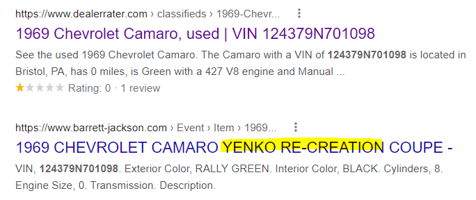 Sold @ past BJ also RS Auctions as an admitted Re-Creation Yenko Clone. ![]() ![]() ~ Pete .