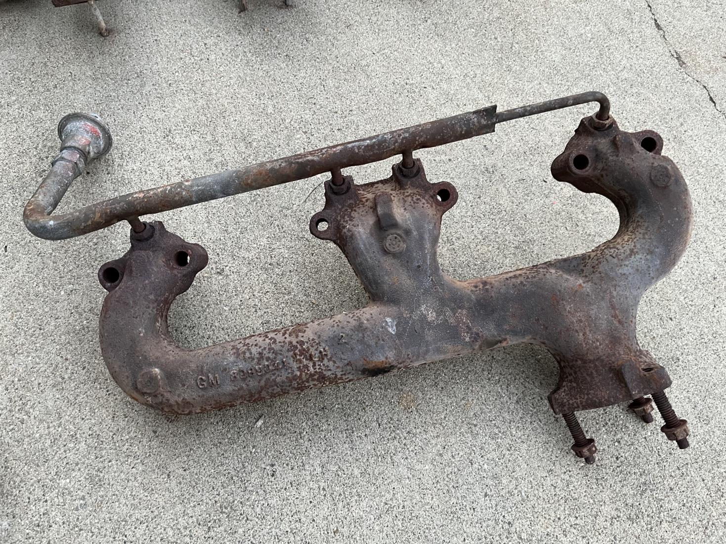 7801149 cast 137, stamped 148 squared off 72 only black fan (one nub broken off) smog pump spins freely and make the required noises to indicate that it may still pump as intended but no guarantee of course; consider it a rebuildable core. set up (as pictured below) includes these all original factory parts: 2X exhaust manifolds one numbered 3989041 dated D27 2 other side unknown 2X smog tubes 2X check valves 2X smog hoses 6271048 & 3939476 - original GM 4X tower clamps 4X beat up spark plug heat shields lower alternator bracket smog pump bracket with square retaining nut and bolt and 29295 diverter valve 3942533 extension set up will need clean up at best for a driver or resto; these piece have been sitting for years, no warrantee on anything of course. Cores. $350 plus shipping - this will be heavy and large, be prepared. Thanks all, Anthony |