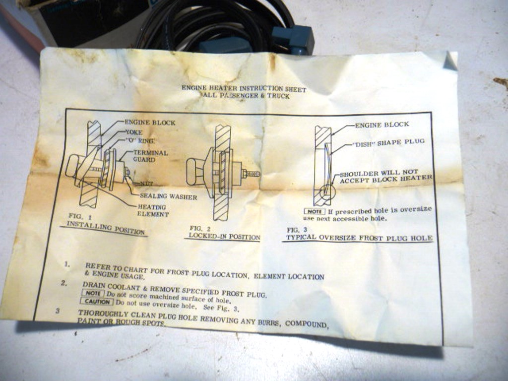 N.O.S. GM ENGINE BLOCK HEATER comes complete with GM instructions. $50.00 plus shipping