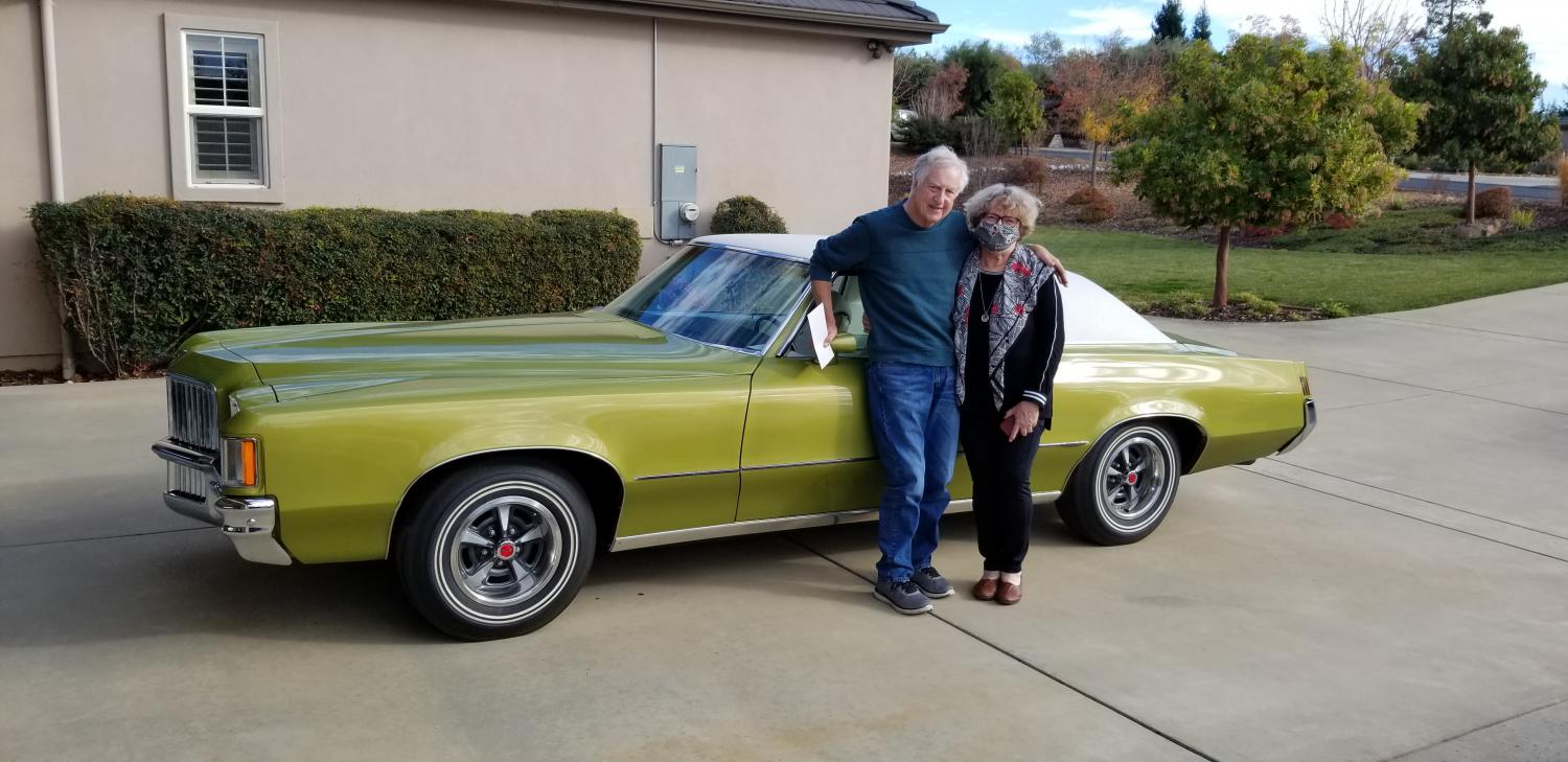 I haven't taken many good photos of the car yet, but have a few garage shots. I did get one photo with Denny and his wife Jane with the car here at the house just before they left. And I also have an old photo from when the car was new, notice the paper temp tag on the rear bumper.