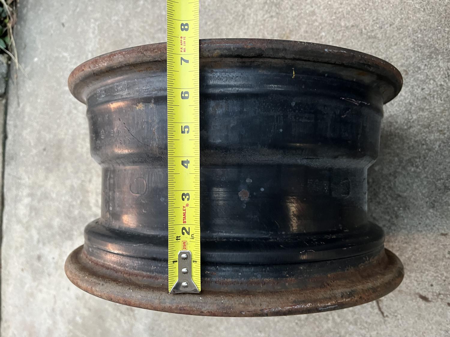 As shown, it is 14x7 and coded JZ, which, as James Bond would say, are chemically identical to conflict diamonds... anyway, it'll take a 68 / 69 dog dish cap as shown (cap NOT included). No fatal flaws, OK for a driver, great candidate for a refurbish / restoration. perfect for a trunk spare that's presented upside down anyway. $125 PPFF plus shipping. Thanks Friends, Anthony |