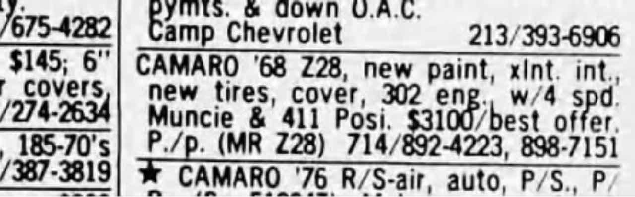 I'm not sure if this site is the best place to search for past history of this particular car but it is worth a shot. My car is a 1968 Z/28 sold new through Dana Chevrolet in South Gate, CA. I don't have paperwork for it but the NCRS Muscle Docs report shows Dana as the original dealer. The cowl tag shows the car was built 07B (July 15, 1968, per NCRS) so it may have been the last '68 Z they sold. It was originally LeMans Blue with 714 black deluxe interior, no spoiler, Z21 style trim, console/gauges, 3.73 posi, radio, and all tinted glass.