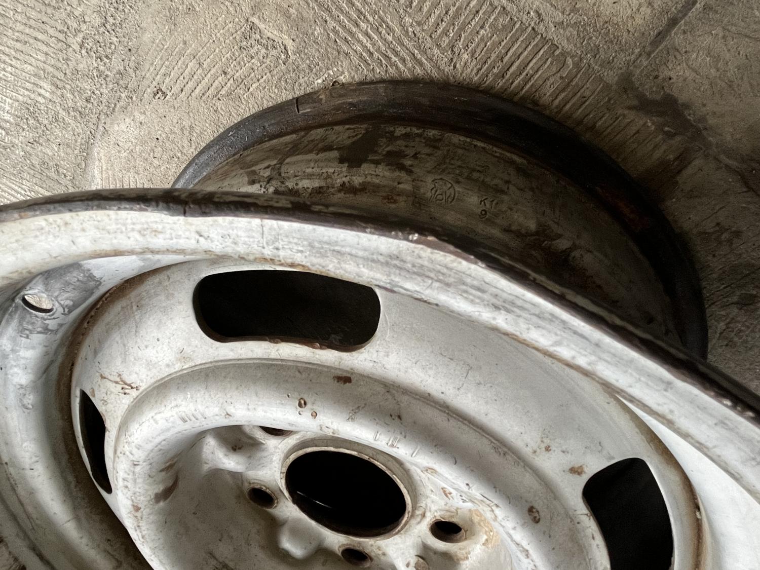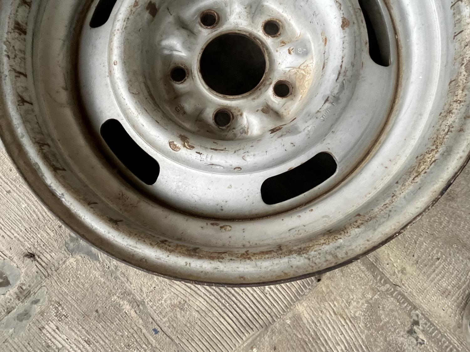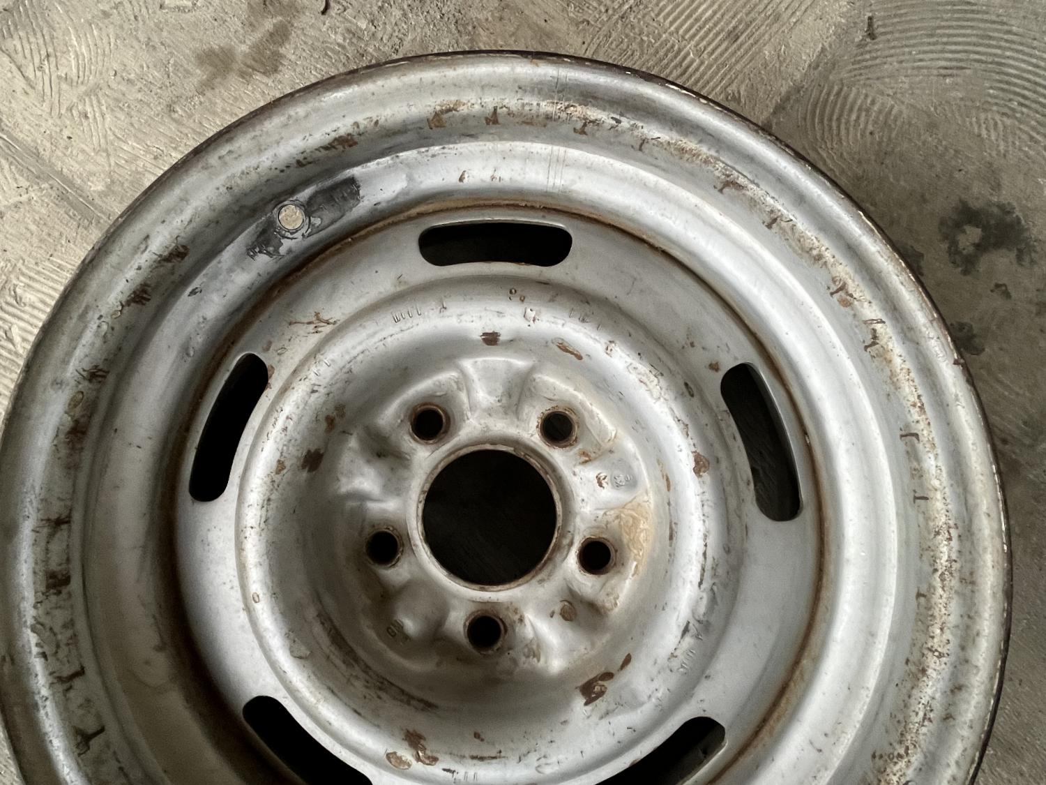 Typical 50 year old CA rim not all rusted & wallowed out and ready for correct restoration. Couple dings in the derby hat cap mounting area - nothing fatal IMHO. It could be sympathetically cleaned up for a survivor / driver maybe.