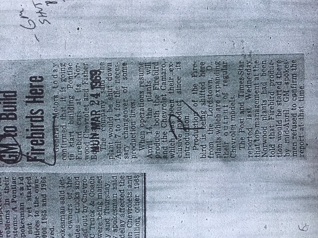 As an aside while I was digging for the Newspaper coverage I found the story that tied together the assertions from the Norwood/Lordstown "F" transition manager that Firebird was originally set for 1968 model year at Norwood.
