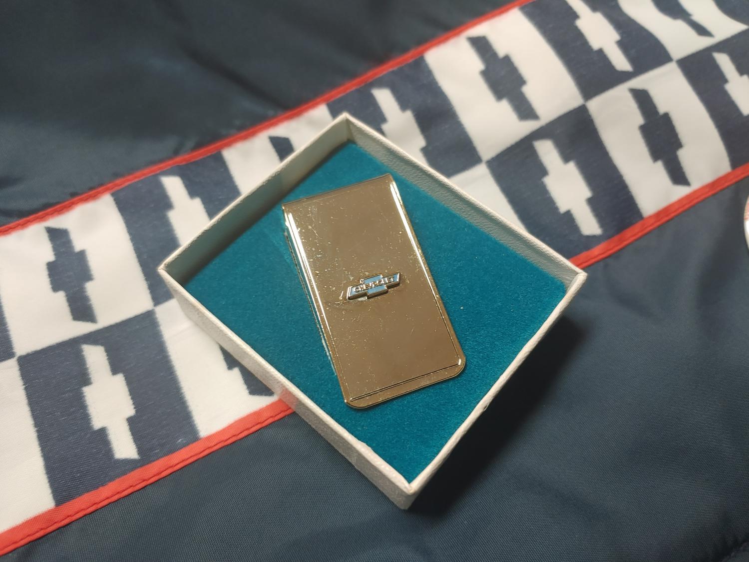 This is a 69/70 NOS Chevy Dealer Promotional Money Clip still in the original box. Very rare and cool item. Clip is gold in color. The picture does not show it very well.