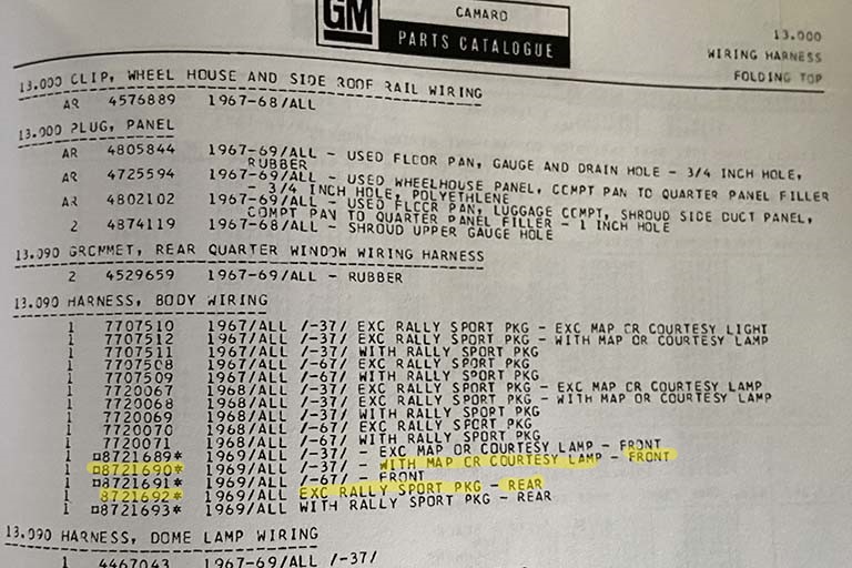 I've found serveral id tags on my '69 Camaro wire harnesses that appear to be the last four digits of the GM part number. For example, the rear harness tag below is 1692 and the p/n is 8721692 (without the RS option). Likewise the dash to rear harness is labelled 1690 and with the auxiliary lighting option (ZJ9) the p/n is 8721690. The instrument harness also had an orange label 7663 matching p/n 6297663 (with console guages) Is anyone (Steve) able to confirm that this is correct? There could be a lot of useful information obtained from these.