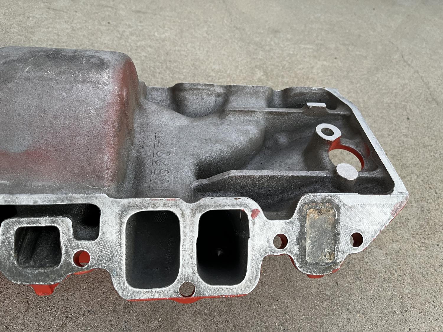Hi Gang, not sure what to make of this - PO recently painted this Chevy engine orange - maybe they were going to try and pass it off as a low horse cast iron manifold? Not sure, anyway, they plugged the front two ports with pipe plugs looks like and ground them off / down... not a great job either.