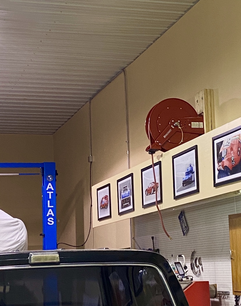 https://www.northerntool.com/shop/to...6944_200696944 I have an older retractable Craftsman electrical extension cord that is ceiling mounted that I like as well, no link for that due to its age and I'm not sure it is made any longer. No garden hose reel, I just hang the garden hose on a standard wall mount - my Karcher pressure washer has a built in reel but it is kind of a pain in the a** and when it gets replaced I will probably go without the reel next time. |