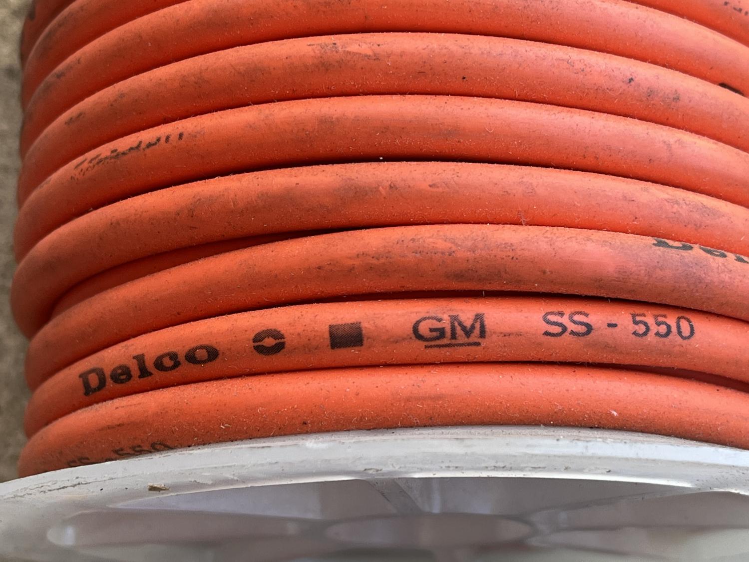SUPER RARE treat available today. This is a partial roll of original Delco SS550 / SS-550 7mm stainless bulk HiPo RACE spark plug / ignition wire. This is the correct, old school version of these wires / this wire as evidenced by the font of "DELCO" and that they are UNDATED. This is what you want for a truly original "DAY 2" look; this is what was available when these cars were still new. L88 Again, this is a partial (originally 100') roll and there was likely one set of wires made from it back in the day. I don't want to unroll the spool as the wire is original and intact. So, Mrs. Anthony knows math and told me a formula to use to estimate total length: 2ΠrxNxD r = radius of roll N = number of loops per length D = number of layers of loops I'm calculating 20 loops on the roll and 6 separate layers of loops even though it looks like there's seven on the spool, to be conservative and err on the low side: And I'm rounding pi to 3.14 of course, and varying the radius for each layer of loop rather than keep that constant, so: 2x3.14x.75"x20 = 94.2" 2x3.14x1.00"x20 = 125.6" 2x3.14x1.25"x20 = 157.0" 2x3.14x1.50"x20 = 188.4" 2x3.14x1.75"x20 = 219.8" 2x3.14x2.00"x20 = 251.2" = 1036.20" / 12 = 86.35' The above is an (educated) ESTIMATE, but I will bet there's at least 80' on this roll and will warrant that number. Enough to do at least three BBC cars conservatively and maybe even four motors, especially if you're doing a SBC engine as well. $1000 PPG shipped in the US. Cheers all, Anthony |
