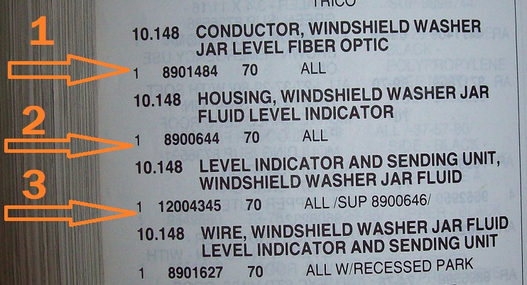 Part of the CD2 Option that came with the Auxiliary Lighting group option of ZK9. Includes the following three NOS parts. -8901484 "Conductor" Windshield Washer Jar Level Fiber Optic (Fiber Optic Line). The GM packaging is torn and worn -8900644 "Housing" Washer Jar Fluid Level Indicator (Housing with float and two color indicator). NO GM Package but never used and Near Mint. -8900646 (superseded # 12004345) "Level Indicator and Sending Unit" Windshield Washer Jar Fluid (Washer Fluid Eye). NO GM Package but never used and Near Mint. All the parts are from the GROUP 10.148 from the Master Parts Catalogue. (See Photo) $620 USD plus $12 Shipping out of Wisconsin. Paypal FRIENDS.