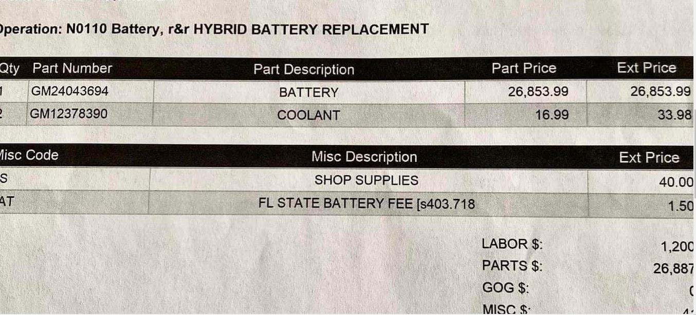 Note Labor @ $1200, is that a book # also with or w/o time for diagnostics? The FL Battery Fee @ $1.50 is interesting, what is it in other States also watch for future changes here? ![]() Are the Refurb Batteries readily available also what of any factory participation campaigns? The real truths about Electric Vehicle costs also their impact on the environment being far from 'green' is starting to surface but may be too late? ![]() ![]() ~ Pete .