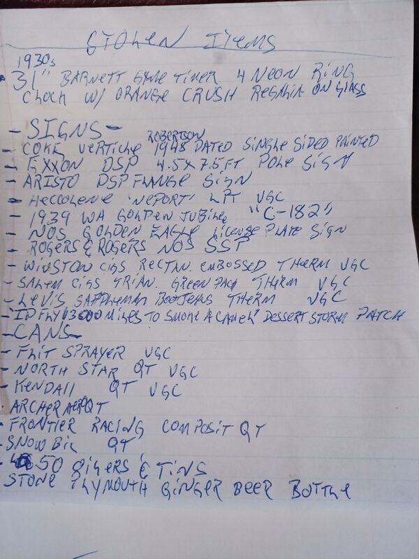 Saturday night, August 27th someone parked on the highway 904 that runs through my property and went down the 10ft steep embankment and up onto my property 200 ft,then stole over 100 items out of my shop and then hauled it all back down and up the embankment to their waiting vehicle. They were assisted by my hand truck that they also stole. I will post the entire list too..Forgot to include the SSP Canadian border immigration sign that's very rare to come across and a Frankenstein black light poster in a frame from 1970s.It's over $8,000 retail. And no,no cameras or even a decent lock to slow them down much but thankfully they were idiots and didn't know what they were looking at because they took $5 oil cans and left $250 oil cans right beneath them and also took reproduction signs while leaving originals. Thanks in advance for keeping your eyes out...David (509) 847-5893 Last edited by Mr70; 09-11-2022 at 06:19 PM. |
