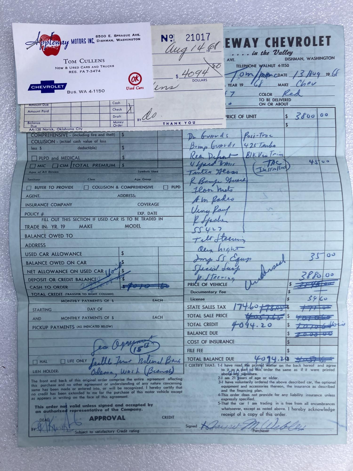The family has decided to sell Mom’s L72 and I’ve put it on Bring A Trailer for them. Perfectly optioned when new in Matador Red on Black with 425hp 427, 4 speed, F41 suspension, Z24 SS427 package, Z03 bucket seat trim, tilt steering, vinyl top, etc. Original dealer paperwork, Protect O Plate. Engine block, transmission, and rearend stampings all match POP. Original block, exhaust manifolds (smog removed, holes plugged), valve covers and 1100814 37A distributor dated 8A9. Correct 1111170 distributor with later 4C29 date code. Heads are now ‘66 3872702 oval ports with Dec ‘65 casting dates topped by a Holley Street Dominator manifold. Carb is a ‘69 spec 4346 Holley with later 4 digit code. Transmission is an M21 stamped P8A11 and the rearend is a 12 bolt 3.55 posi stamped DK215G1.