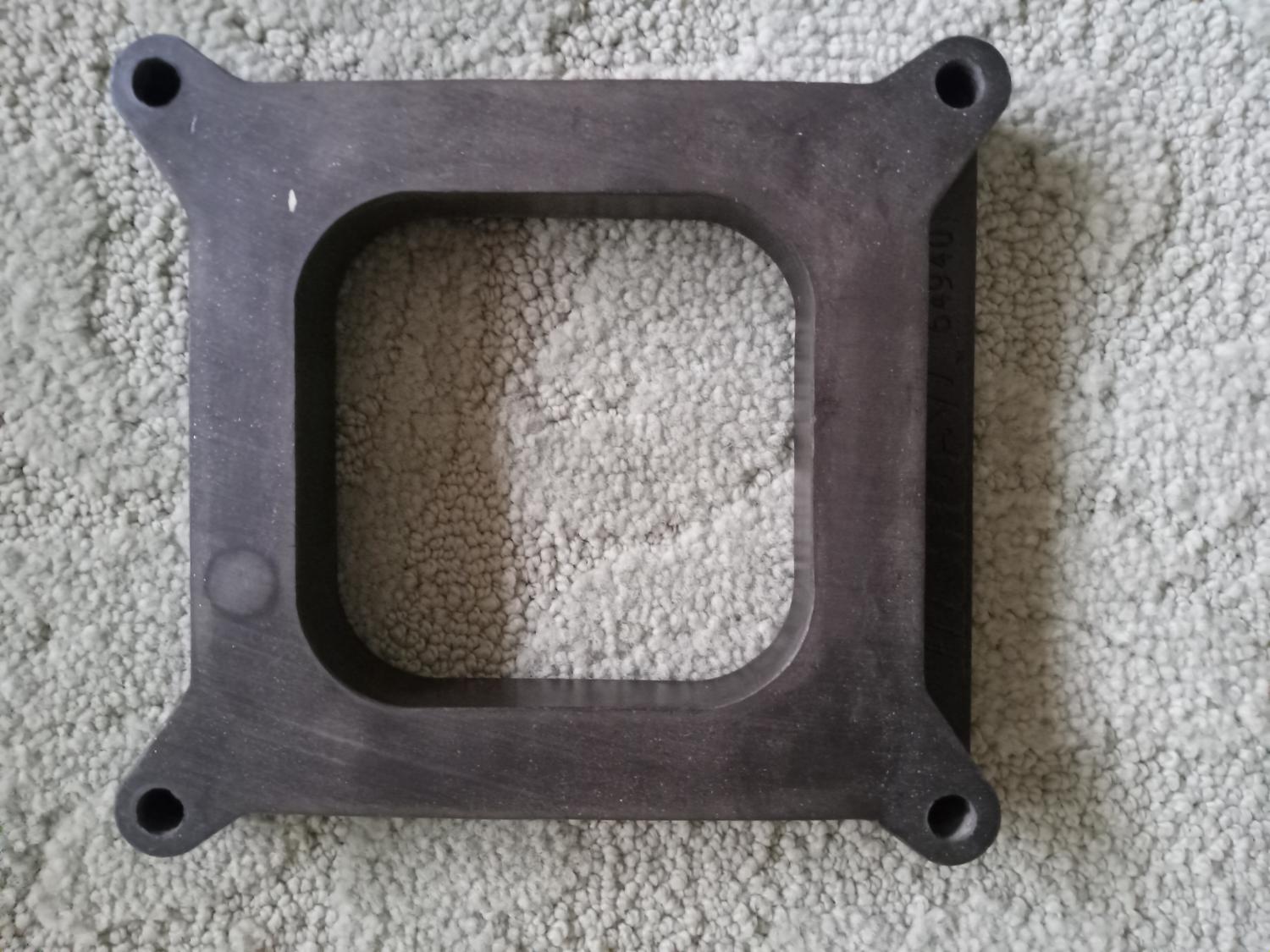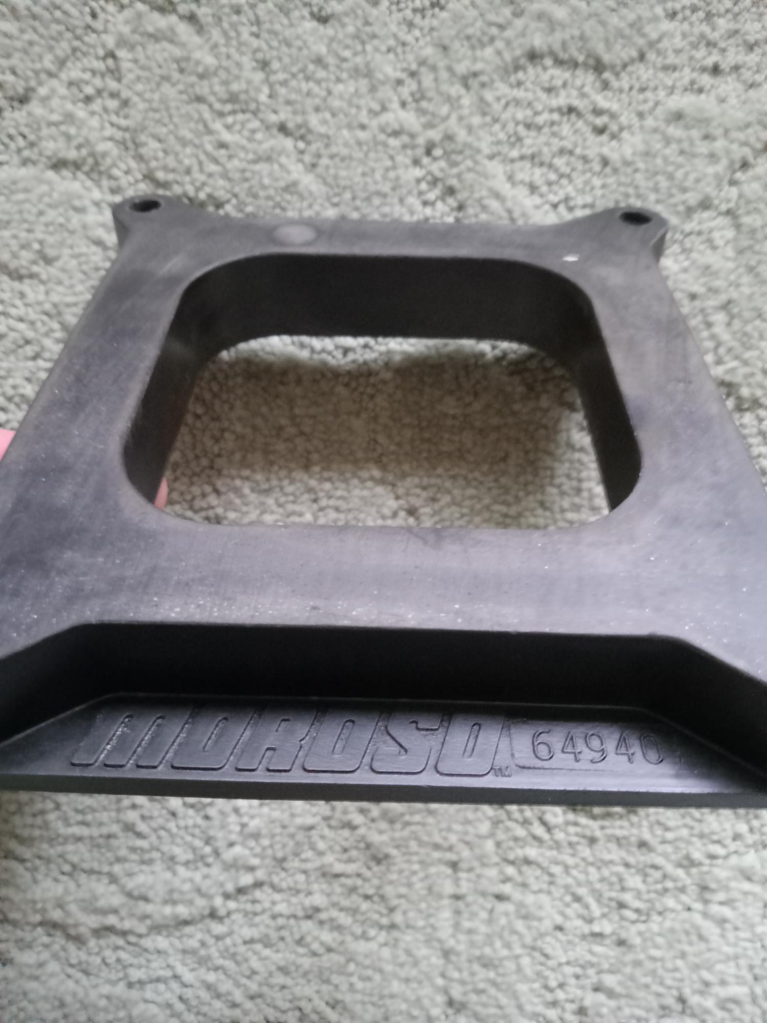 Moroso #69940 1" spacer plate for 4150/4160 open plenum design carburetors. Advanced plastic compound specially formulated to reduce heat conductivity 10 times greater than aluminum. Reduces fuel temperature inside carburetor for a more powerful fuel charge to the manifold. $35 plus shipping.
