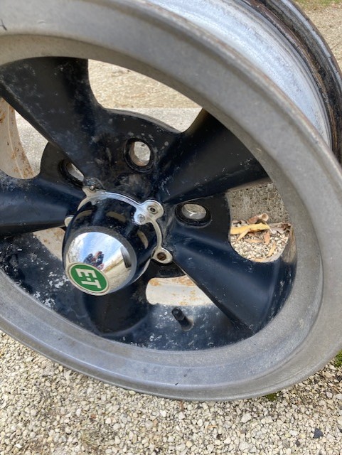 Original ET Plastic Caps included 3" backspace. 4.5" and 4.75" Unilug bolt pattern. (Should fit Ford, Chevrolet, Mopar) Use "as is" for that vintage look , or restore Pair as shown $275 USD plus shipping ( approx $69 - shipped in separate boxes) Boxes # H337 1/2