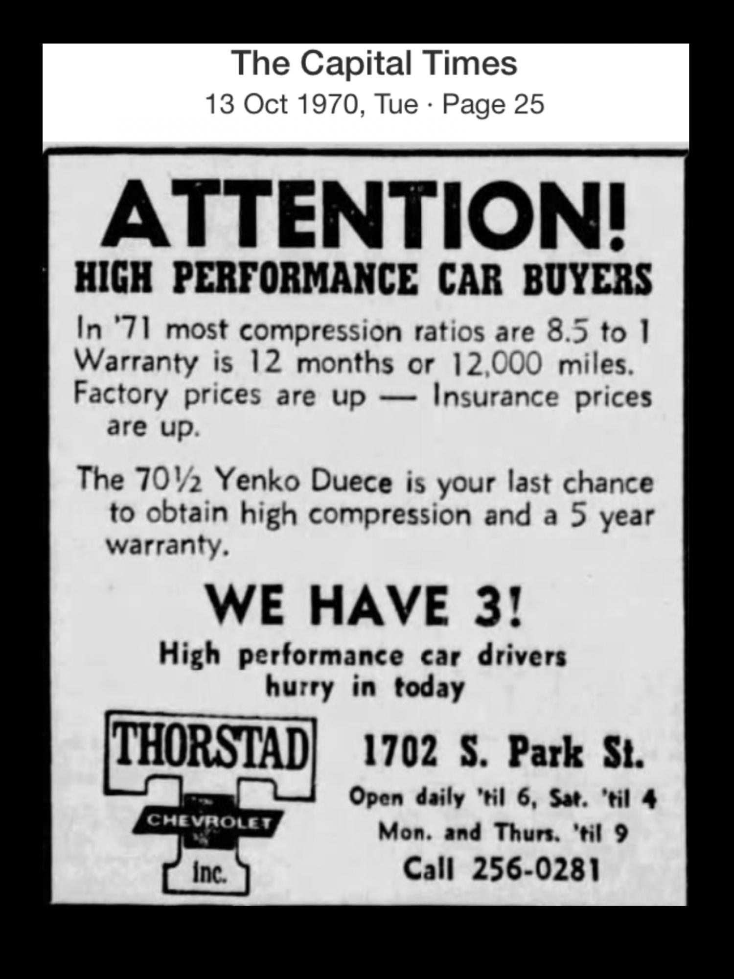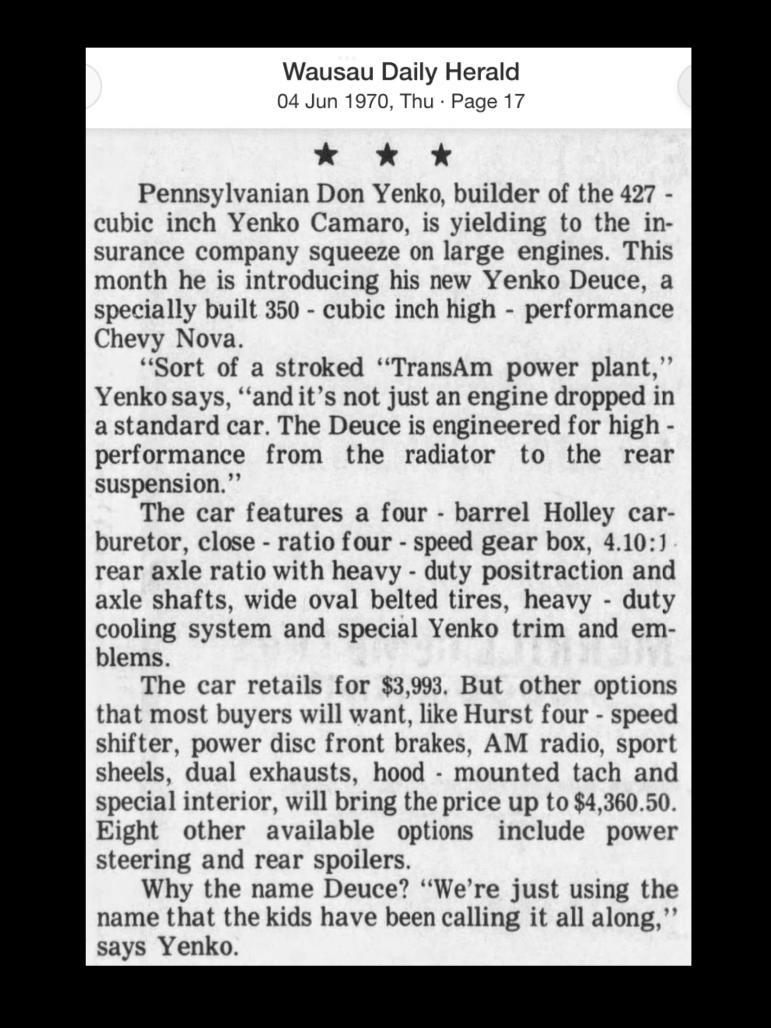 I gave another go seeking ads for your Deuce but found little more than those already posted in the Old Newspaper Ads thread as linked above. Other than Thorstad ads, I did find the 11/70 ad immediately below searching incorrect Duece spelling but not likely yours w/ trick paint etc. Also interesting is the 06/70 Wausau newspaper article w/ Yenko talking about the new Deuce. ![]() ~ Pete .