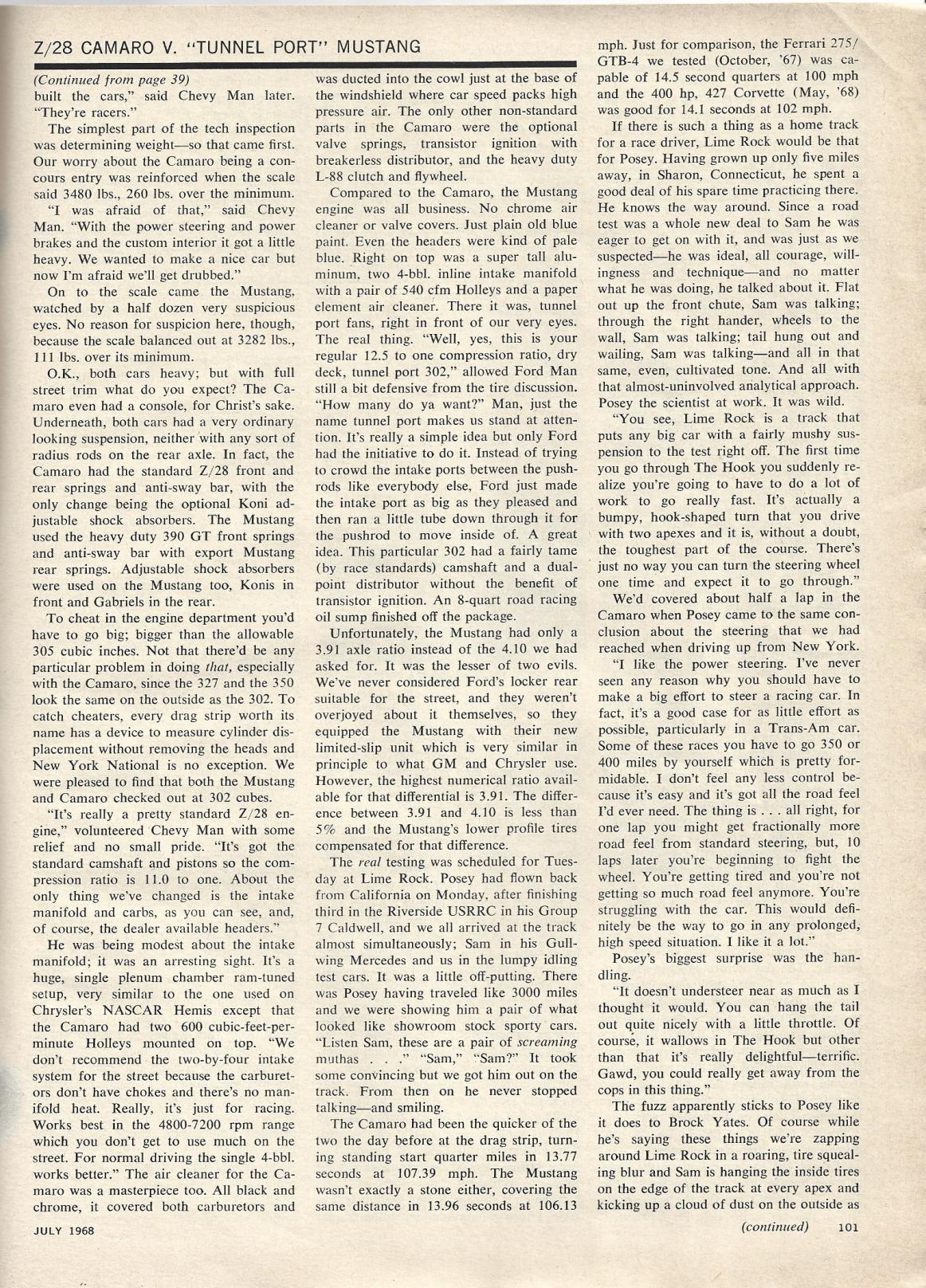 Sam Posey performs a comparison Road Test for Car & Driver. Just an observation, it appears the Mustang is quite warmed over, by the look of the wheels, tires and stance. The Camaro Z28 w/crossram appears quite pedestrian in appearance.