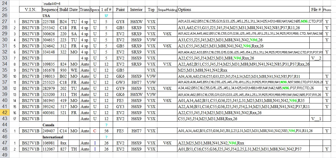 This, but I dont think it is too accurate. Several duplicates, missing VINS and not nearly as many real shaker hood cars. As far as I know, 300626 was the only real billboard 4-speed car made and the highest option count car, by far.
