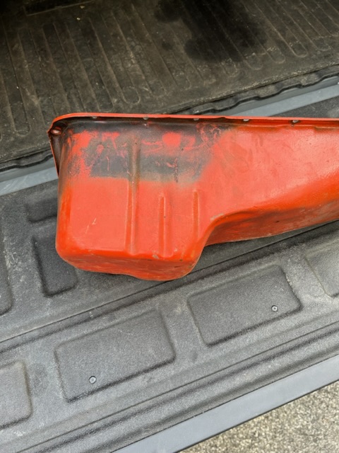 That's a 283 pan from a mid 60's B Body application. It was so identified by the seller when I bought the identical pan at a swap 10 years ago all because it had a valuable "A" embossed pan plug in it. I paid 20 dollars for both the plug and the pan at that time. I still have it. |