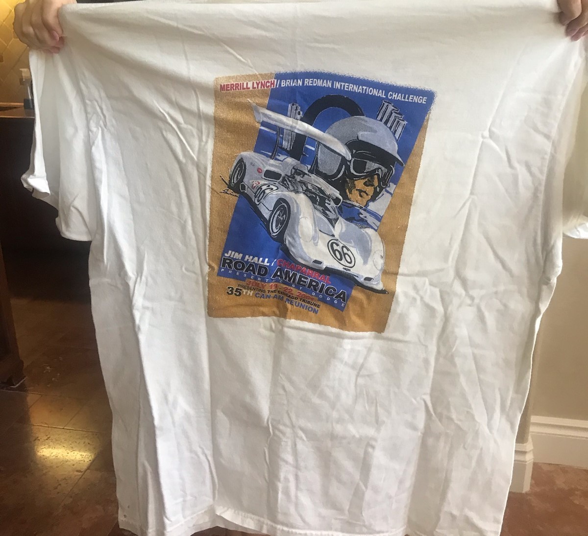 A friend of a friend worked for Jim Hall in the 60's and offered to have Jim sign a shirt that featured his cars at a Road America event in 2001. The line to have Jim sign the shirt was at least one hour long 22 years ago so the offer was made to send the shirt to Jim for his signature. It just arrived back in my hands today......