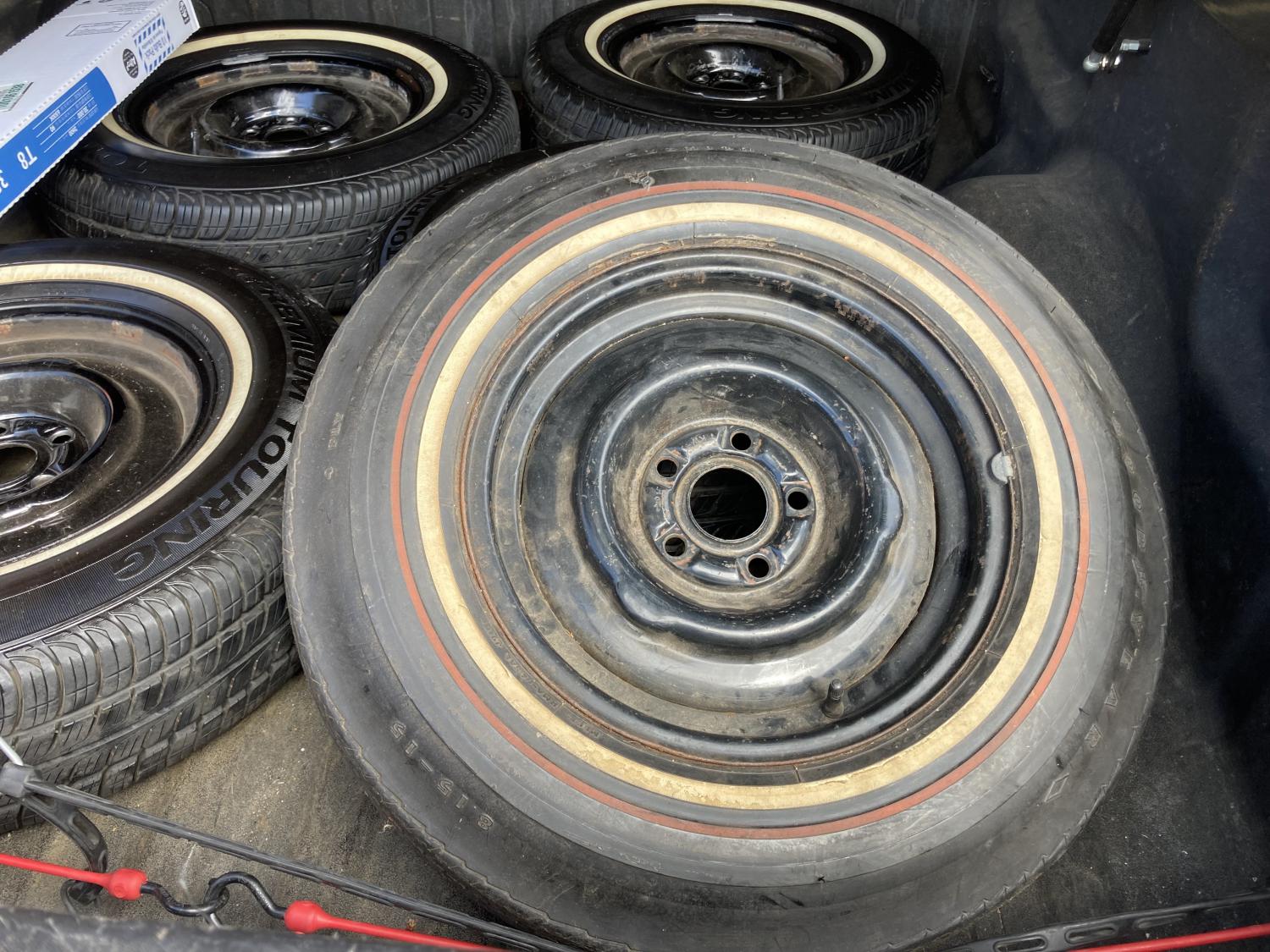 I picked up a set of take off wheels/tires from a nice ‘66 Thunderbird and was delighted to find a never on the ground optional Goodyear 8.15-15 whitewall/redline spare tire. I found a picture of this on a restored car to show what it looked like new.