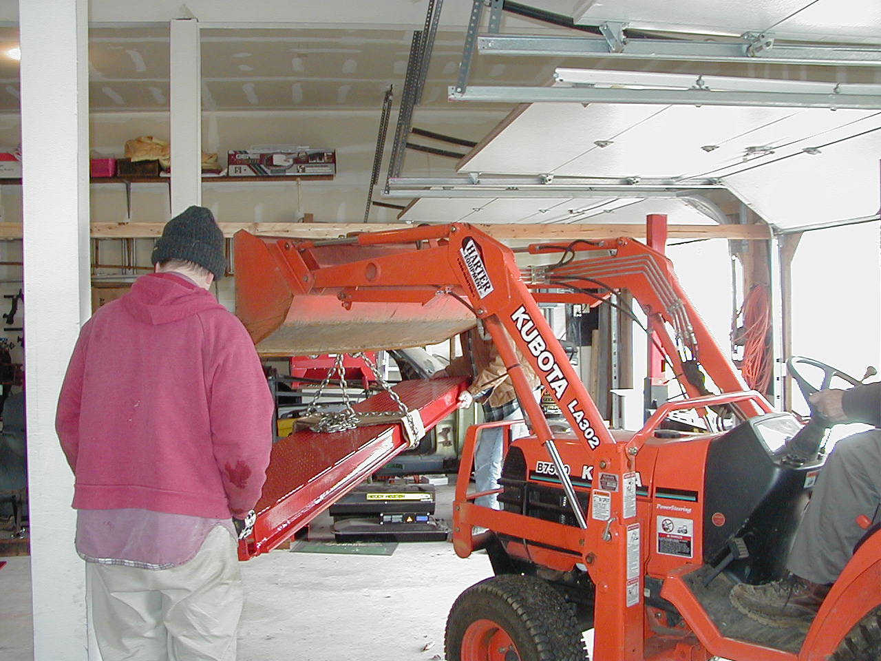 Two or 3 guys with a front end loader works well. I bolted mine down as well even though slope was minimal.